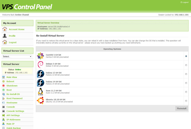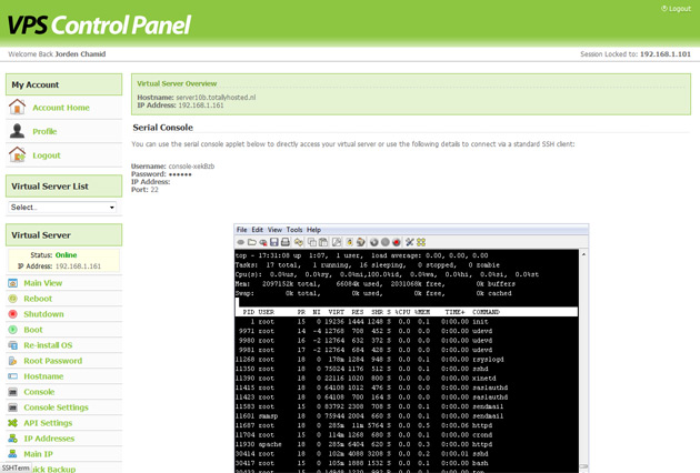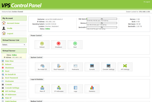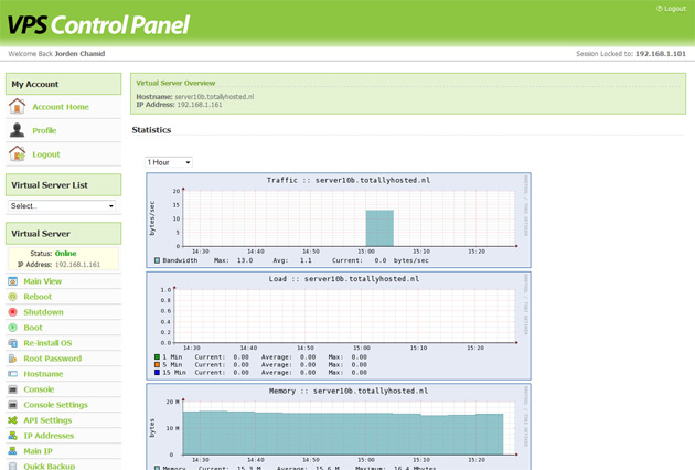 Totally Hosted offers a VPS control panel, with which you can view your VPS statistics and manage your VPS (shutdown, restart, reinstall).
